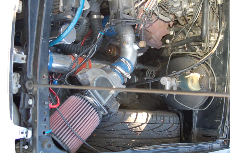 Stock 2.4L 22RE, Custom Garrett GT25R turbo setup, TiAL blow-off, AEM F/IC,intercooled, custom intake, relocated wire harnesses and items over inner fenders, inner fenders removed completely, clutch master cylinder relocated beneath dash, relocated Optima battery (yellow top), fully TIG welded Magnaflow exhaust, relocated gas tank beneath bed, Clutch Specialties Stage 1 clutch disc/pressure plate, DOA Racing timing chain with metal guides, Garrett boost gauge