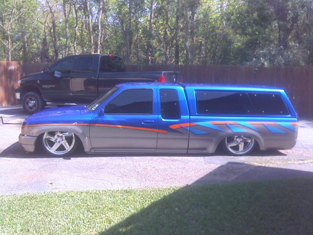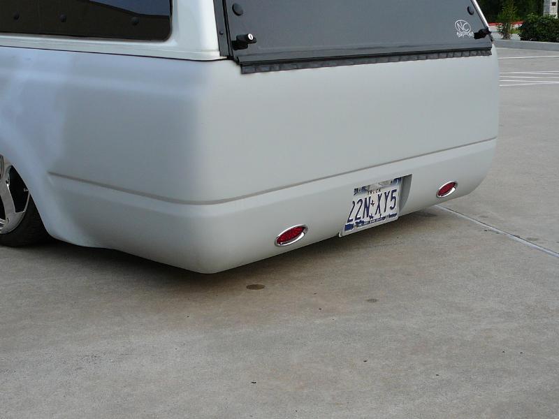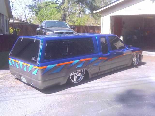 Rear GM door handles, tailgate skin with body line,shaved tail lights, Hagan tail lights, phantom grill, shaved marker lights Shaved squirters, shaved blinkers in bumper,shaved cowl vents, Leer shell, True blue pearl with Chevy Pewter. Graphics by Maxwell Designs. Paint by Kustom Werx.