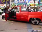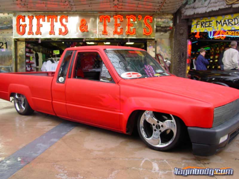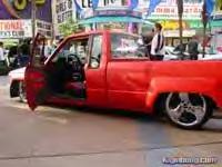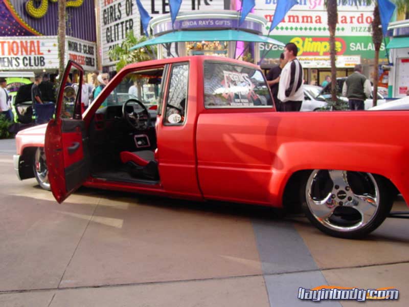 Faster bag set up, 3 inch body drop and black paint with red leopard flames.