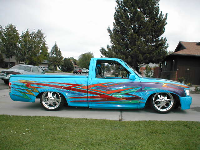 shaved:antenna, hood squirters, rock guards, cowl, 2wd bumper moulded w a 4wd valance and a trenz billet insert...trenz billet grille, shaved door handles, tailgate handle relocated, smoothed out tailgate, sir michaels roll pan..recessed license plate. 4wd fenders, clear corners, bumpers and clear tails. 18 shades of ppg paint....(cool ice blue base w grappix)