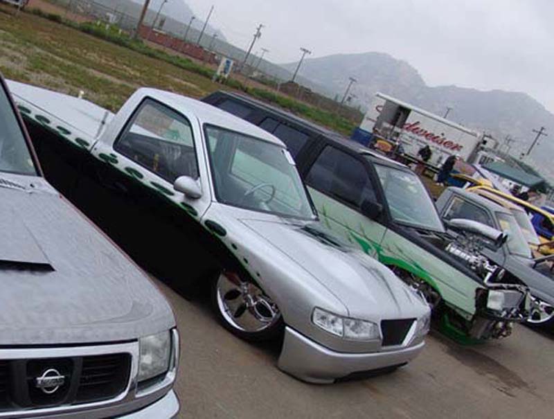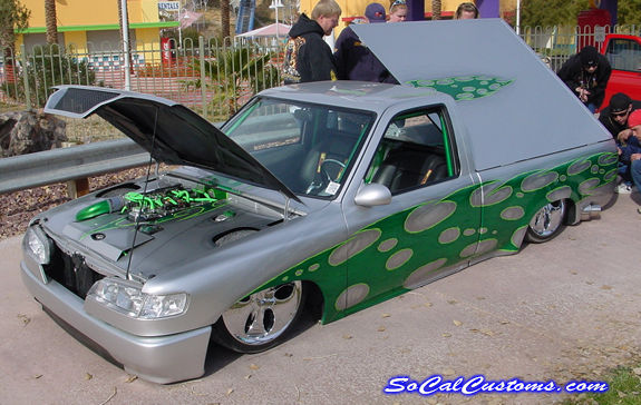 Up front, the suspension has been detailed to death with plenty of Glasurit Silver and a custom-mixed Green. The front has been 'bagged using smaller Firestone airbags, running 1/2-inch lines to SMC valves. Additionally, the frontend was given an additional 2 inches of alignable drop using a pair of Belltech dropped spindles, and Doetsch Tech drop shocks. In the rear, things really get busy with the factory rearend a mere memory. In its place, an '86 Nissan 300ZX rearend makes everything fully independent, with larger Firestone airbags mounted above the upper control arms with flame-cut flame-shaped mounts built into the tubular rear subframe. Since the 300ZX lower control arms serve as the lower 'bag mounts, Josh gets a full foot of articulation in the rear when the rear shocks are removed.