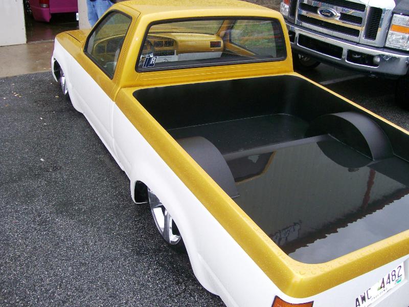 Lower dash fiberglassed, stock bench cut down, pleated, faux leather and suede, suede headliner/back wall/B pillars, marble shift knob.