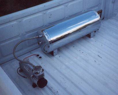 custom air ride...cantilever 4link setup in the rear...vi-air 450 compressor...5 gal. chrome tank...1/2 inch lines...f/b...2 switches...
