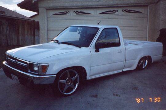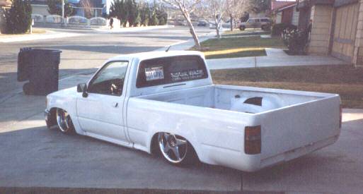 shaved gas door...wiper cowl...molded tailgate...custom tails...antenna...mirrors... gravel gaurds...squrters...flush mounted civic handles...fuba antenna...flush mounted L.E.D. 3rd brake light...4runner bumper...chrome 18's...body drop...lexan window w/ plate box...