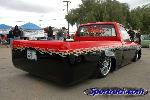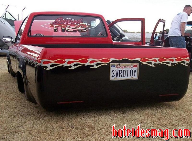 The body has been shaved of; door handles, bed rock guards, windshield squirters, cowel vents, antenna hole on fender, 3rd brake light, tailgate handle, tailgate bodyline, tail lights, and gas door. I added a roll pan with LEDs and welded the tailgate shut. I also added a frenced box to the tailgate to hold the license plate. I did most of the bodywork, but had some help from my brother Kevin, Robert Ardy (Browneye), and Ben May (Benji).