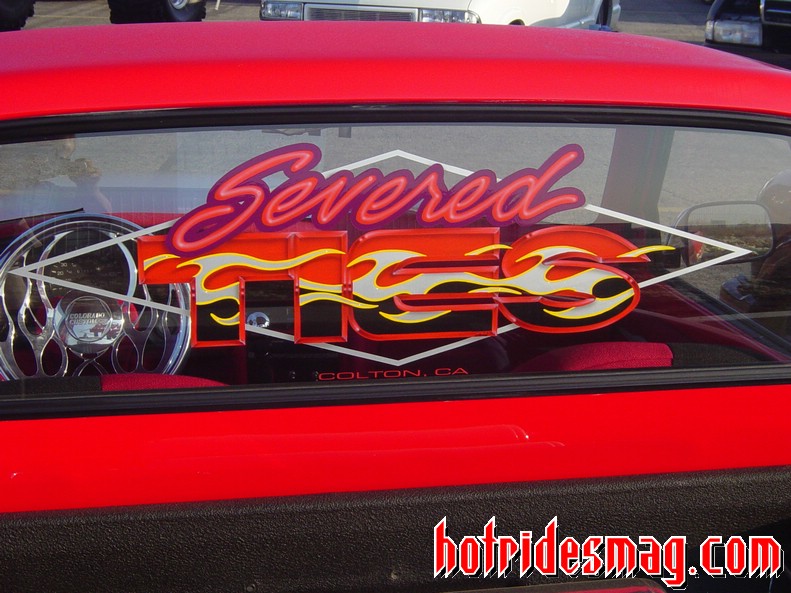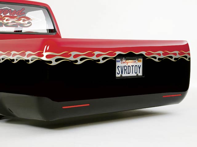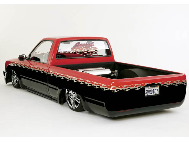 Finish bodywork and paint performed by Ed Warren (Fast Eddie) of FED Customs in Yucca Valley, Ca. Ed painted the truck to match my logo with Spies Hecker Permacon 2002 Audi Lazer-Rot Red and midnight Black two-tone with a metallic silver flame outlined in bright yellow that divides the red and black. Dupont cleared, color sanded and buffed to perfection.