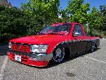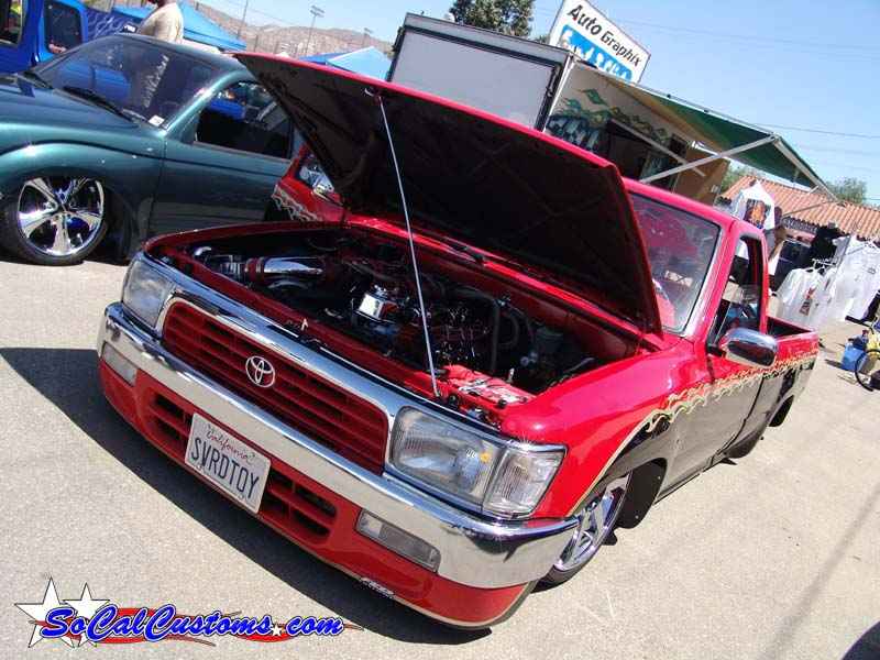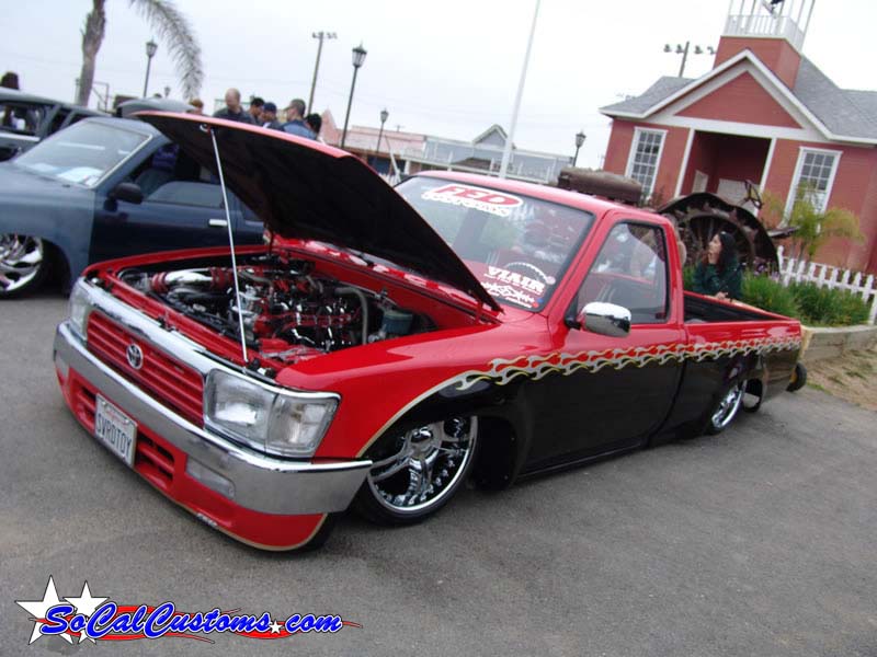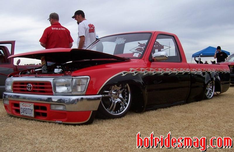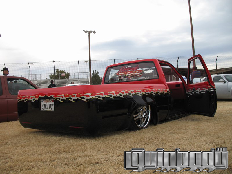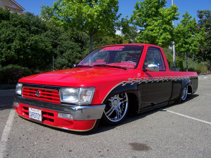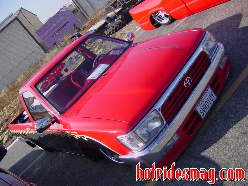 Before flames continue down the side of the truck, it starts out as a straight line all along the bottom of a Toyota 4 Runner valance and skips over a chrome and red 4 runner front-end and onto Toyota 4x4 fenders.