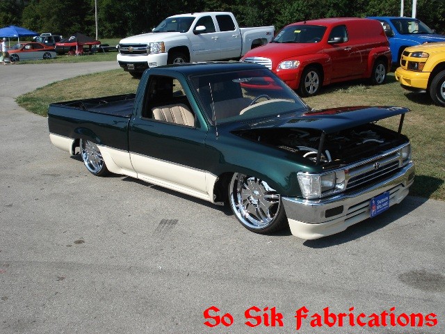 Fully shaved, with a new two tone paint job, 1999 Tacoma green and 2005 VW Bug Biege Sherwin Williams paint. 4x4 fenders, bumper, and grill. Custom sprayed in bed liner that matches the paint.