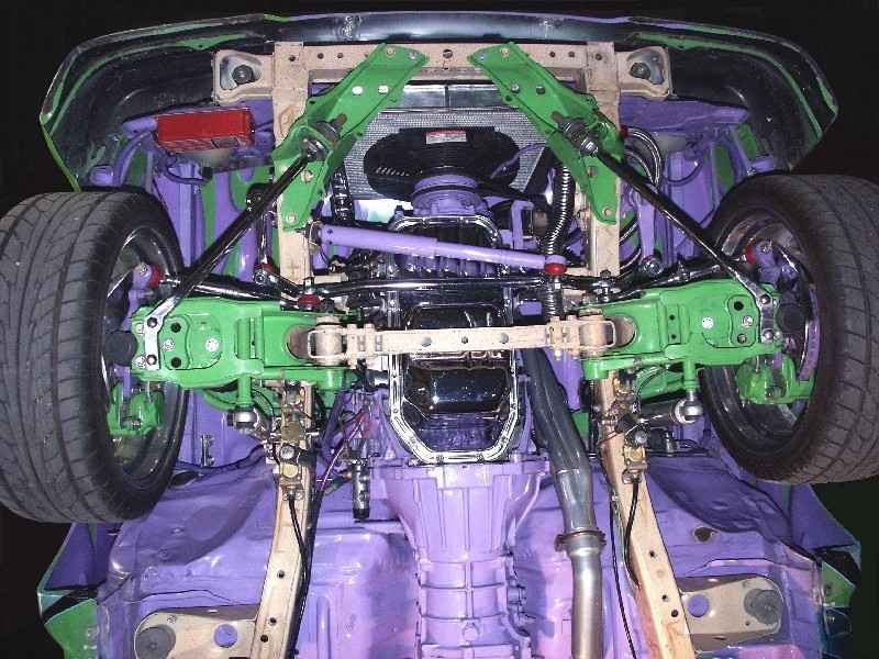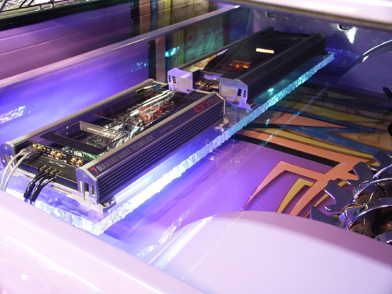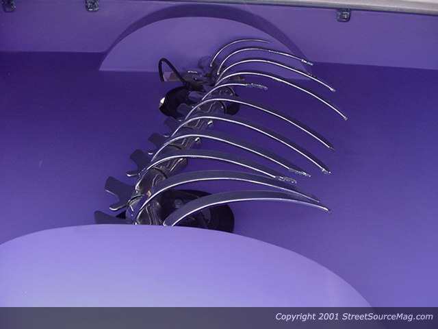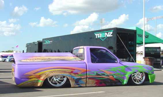 Fully shaved, Custom l.e.d. tail lights Hidden in the graphics, semiphores(turnsignals in the b-pillars), custom mirrors. Custom graphics. "graphic excavation" on the tonnue cover. Custom stained glass rear window. SPECIAL THANKS TO BRAD HOUK FOR HIS WORK ON THE BODY & SUSPENSION.