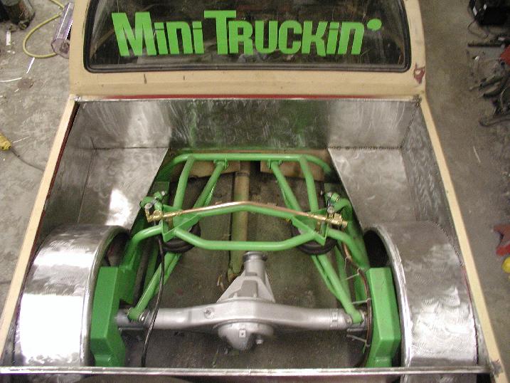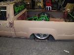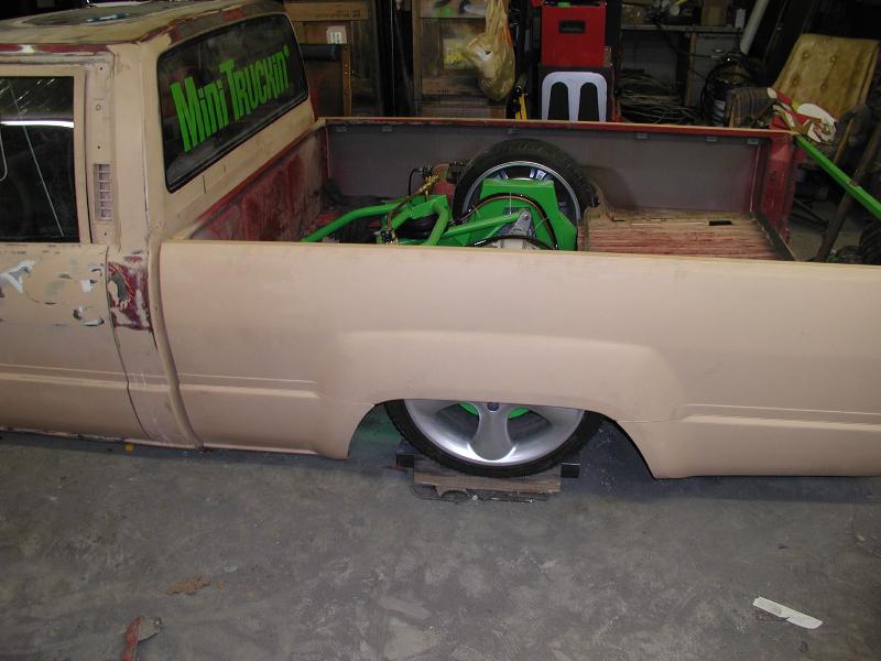 About 4 different colors of primer right now. 4WD bed and front fenders. Cut the roof off and chopped it down so it will be a full time vert from now on. Pulled the doors off and skinned the door openings. Grant Fab tailight fillers, full skin combo out back. Welded and shaved ALL the body/bed seams. Shaved hood pissers, antenna and front corner lights. Chrome 2WD bumper and valence. Sheetmetal bed floor (whats left of it) and boxed the back half, so I can have somewhere to put the beer @ Showfest.