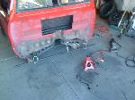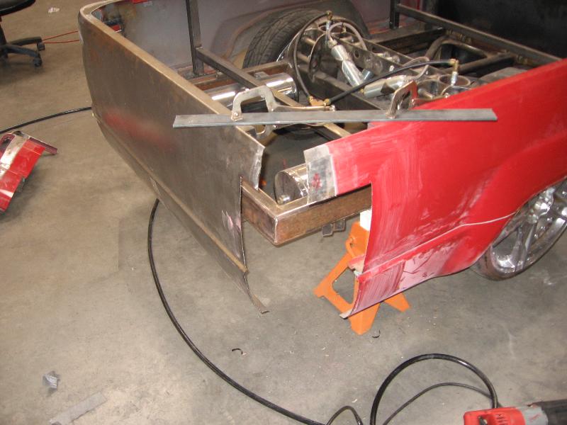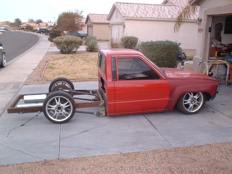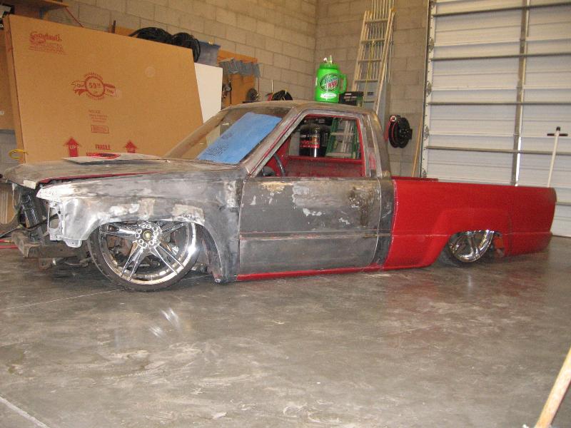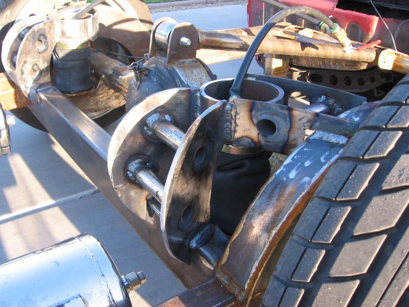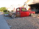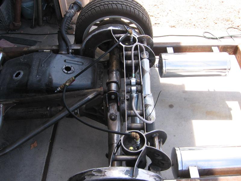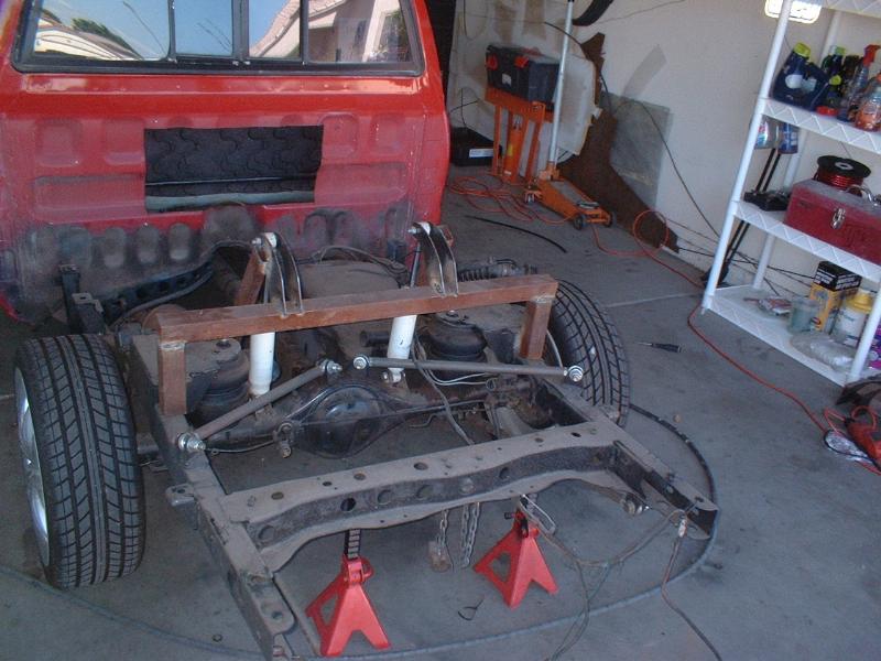 stock floored till the rockers hit the ground, slam bags up front, arrnot air sleeves out back. custom three link, stock gas tank, double frame rails iunder the cab, custom rear clip. Pro comp res shocks all the way around, Two three gallon tanks, still need compressors.