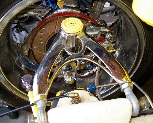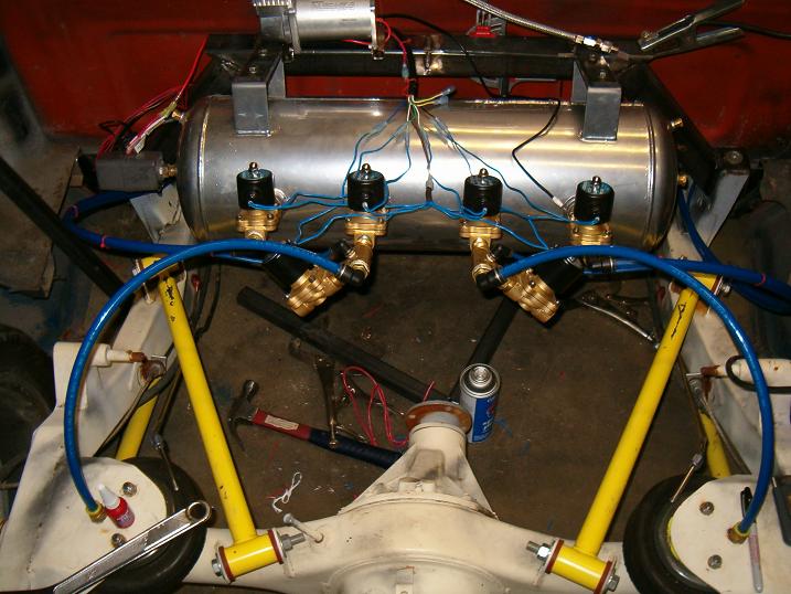 4-link triangulated rearend by Steve at Alter/CanDo. Camber is perfect at 4" up front. 2600's in the rear, 25's up front, ARP 1/2" valves and lines all around with a ViAir 320 compressor and 9 gallon tank (POS from AIM).