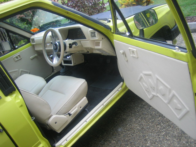 complete re-trim by North Coast Custom Trim on the Sunshine Coast. Custom door cards with playing card logos (hearts, clubs, spades and diamonds), smoothed and painted dash, retrimmed seats, billet steering wheel all in matching cream color, charcoal grey carpet