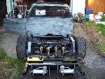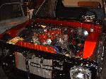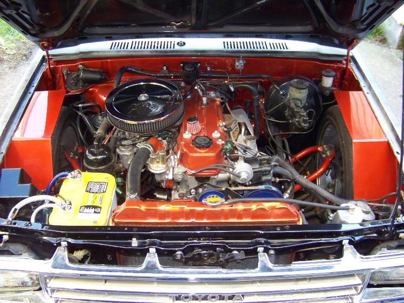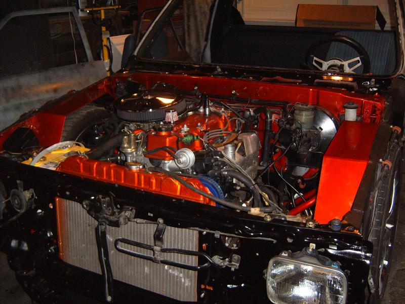 22r bored out to 4" (yes 350 flat top pistons) with badger sleeves, cross drilled water jacket between cylinders for cooling, shaved head with 2 links out of timing chain, OCG cam, centerforce clutch, lc distributor, and many other misc things, painted HOK kandy tangerine & cobalt blue over silver base. OH YEAH!! FITS UNDER THE STOCK HOOD W/O A Z & W/O LOWERING THE MOTOR!!