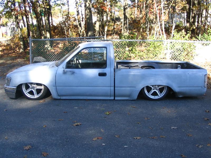 primed grey,4runner grill,4x4 fenders and hood,3.5in bodydrop,sectioned oil pan,step notch,tubbed out firewall,new all chrome 2wd yota bumper/valance,new bed,shaved tailgate handle,mirrors,tailgate,antenna,wiper cowl vents and squirters..more to come