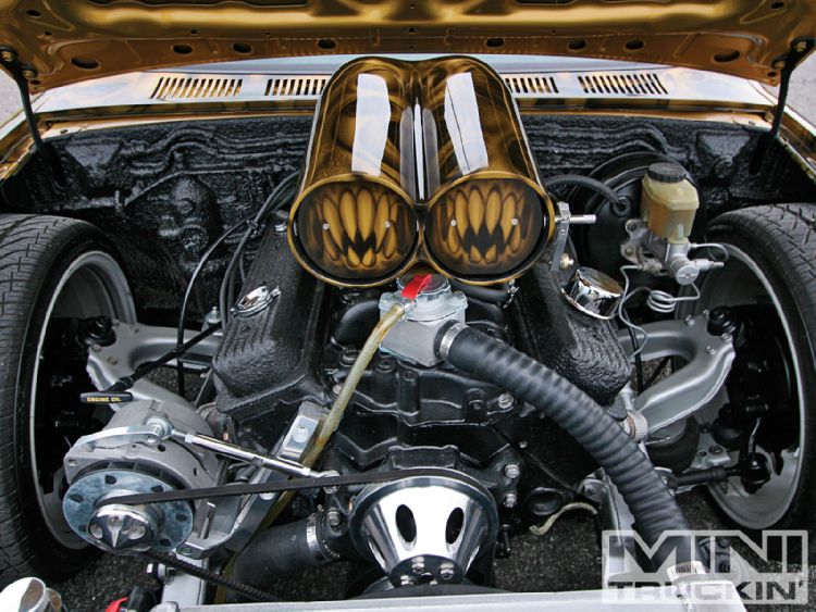 350 mild buildaluminum pulleys custom alt. bracket,aluminum raidiator,shotgun scoop,holley intake up with a 700r4 transmision smoothed out fire wall and some more wierd shit rollin in to it