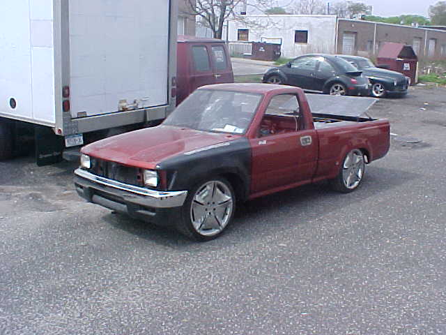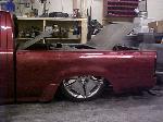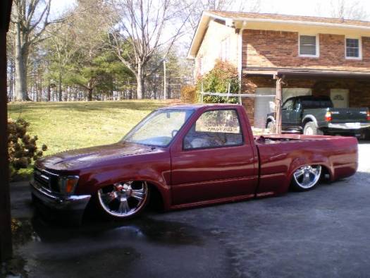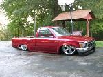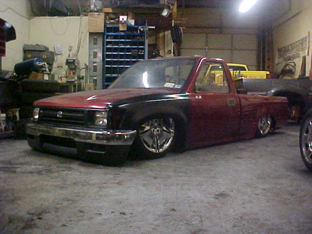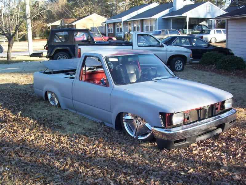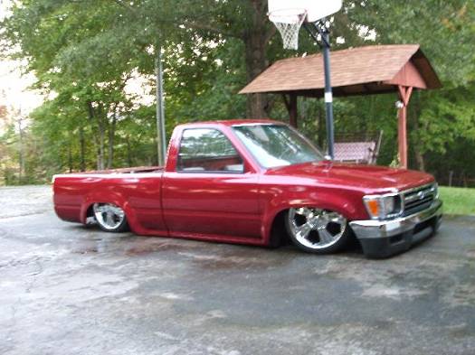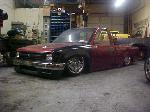 shaved everything,molded cowl into fenders and fenders into rockers,taco front bumper,stock 4x4 fenders,custom sheet metal bed cover with two trunks,box n tube sub frame,tranny crossmember,body dropped n lower'd cab mounts,(b-drop+20's+heat in the north east=cool)