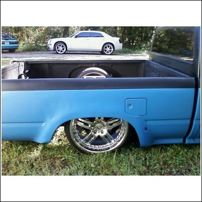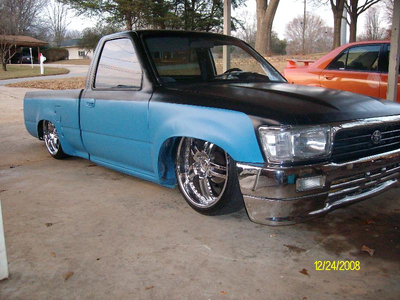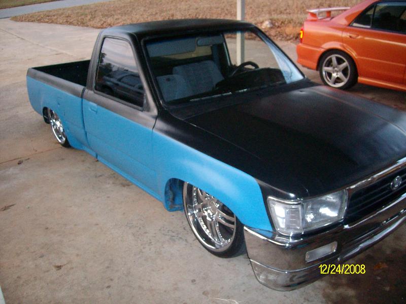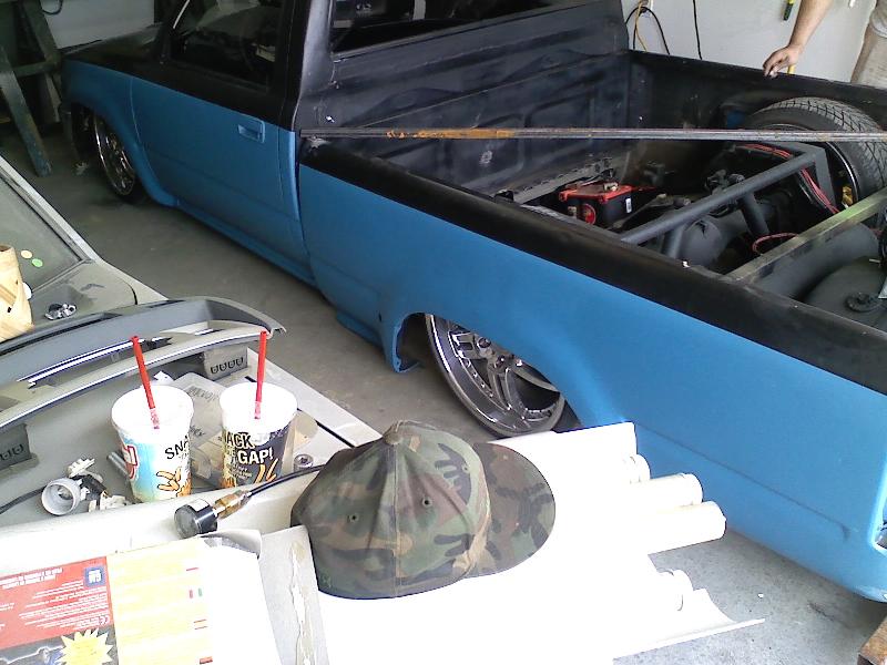 Black and blue right now paint coming soon. Shaved tailgate and roll pan, and antena. 4 runner front end.