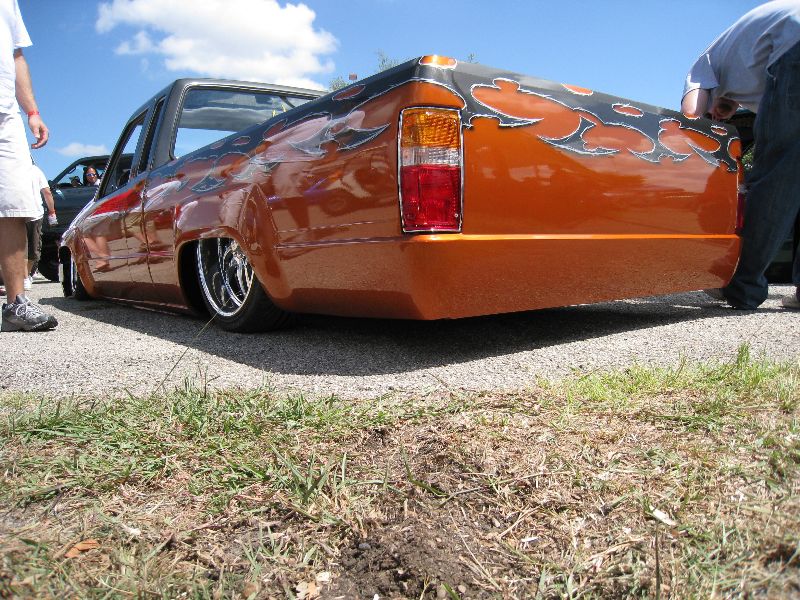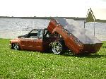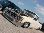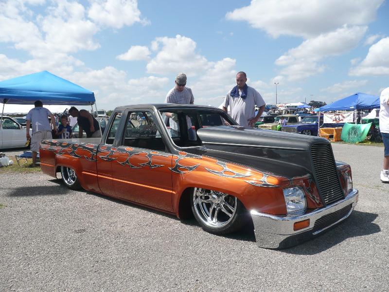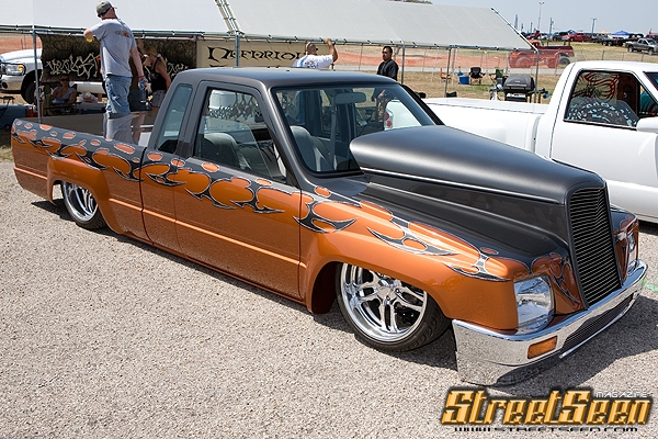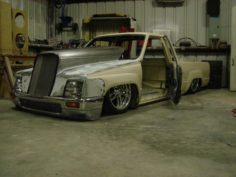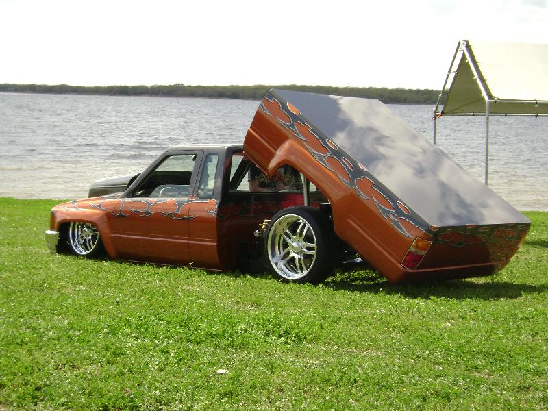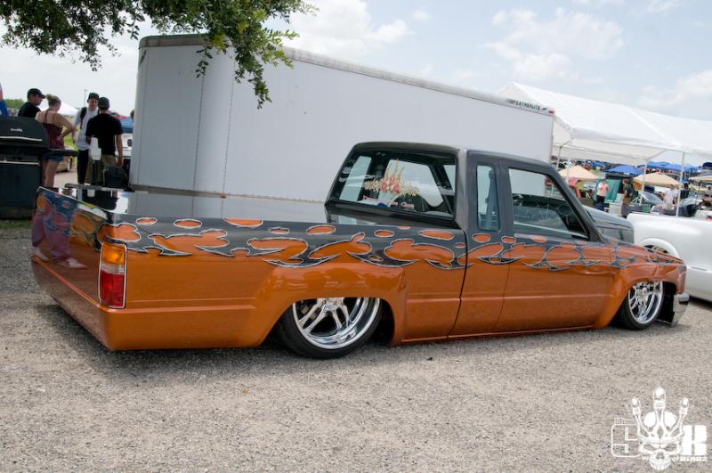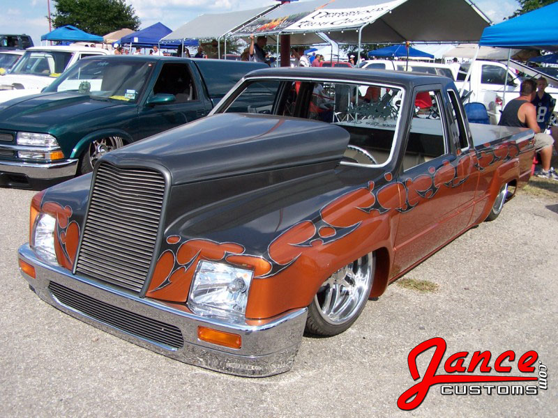 shaved doors, mirrors, wipers, gas door, bed seam, and driprail. closed bed. modified x-tra cab windows. modified, suicide doors. added sunroof and recessed frame. modified 1933 ford coupe hood. custom horizontal grill. toyota tacoma crystal clear headlamps.