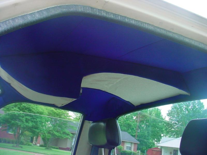 blue & bone tweed w/ a lil blue carpet here n there, overhead console for radio