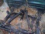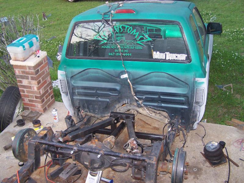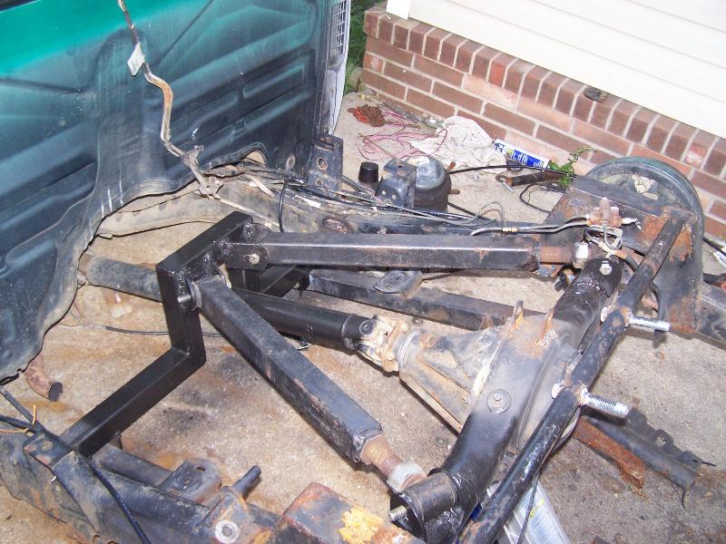 fliped ball joints, viar 480, 2500 bags on front 2600s on back, triangular 4 link with bags mounted bottom bars. has a lot of lift. now draging transmission mount.remounted shocks and sway bar.