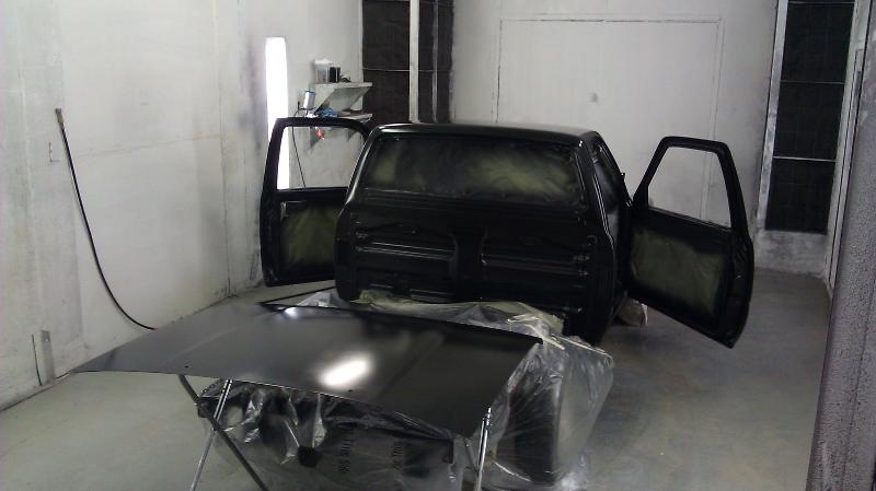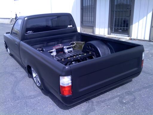 Shaved tailgate, Grant roll pan, shaved rock guards,antenna,stock mirror mounts. Flat black all done by Salerno Body and Paint