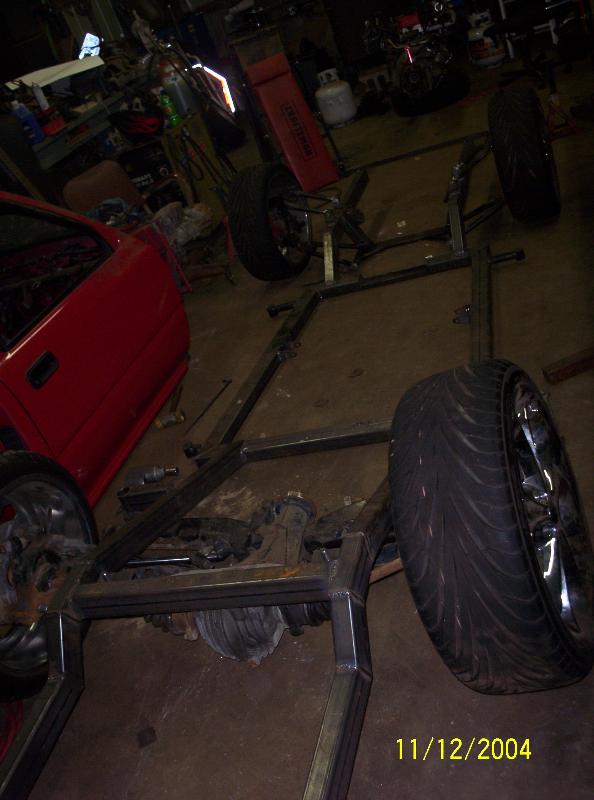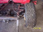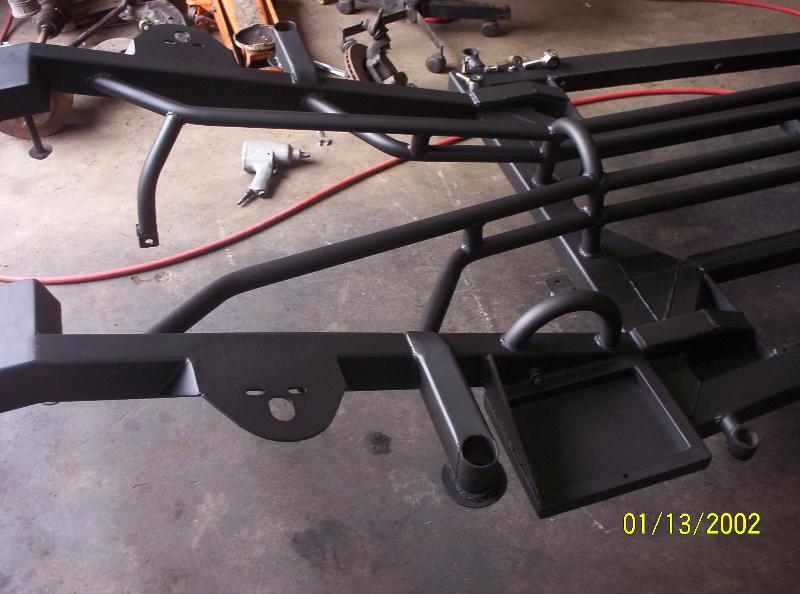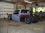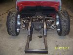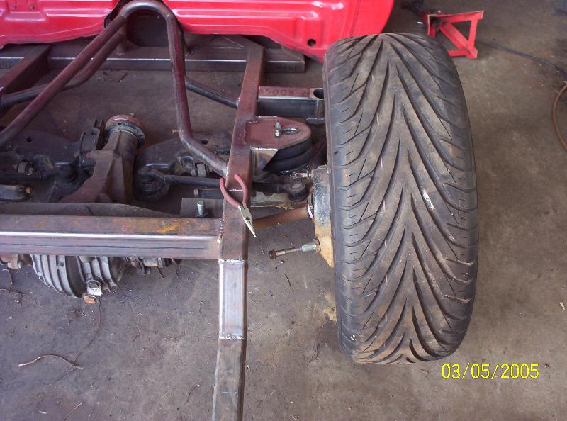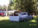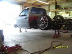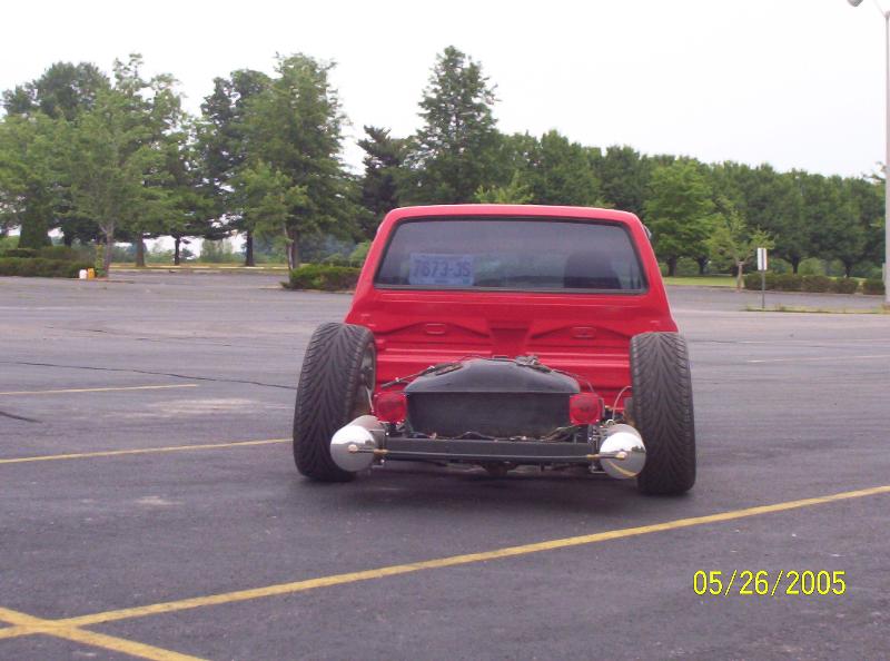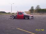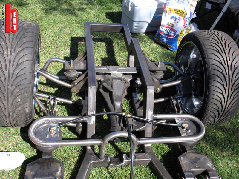 Body dropped 3in.,full frame, tubular upper and lower control arms, modified Mazda Rx7 third member and knuckles to an unequal length controlarm rear end. 3/8 Smc valves, 2600lb bags in the front, 2500lb in the rear. Setup for 20's all four corners. All work done by owner and Hooie's Fab Shop.
