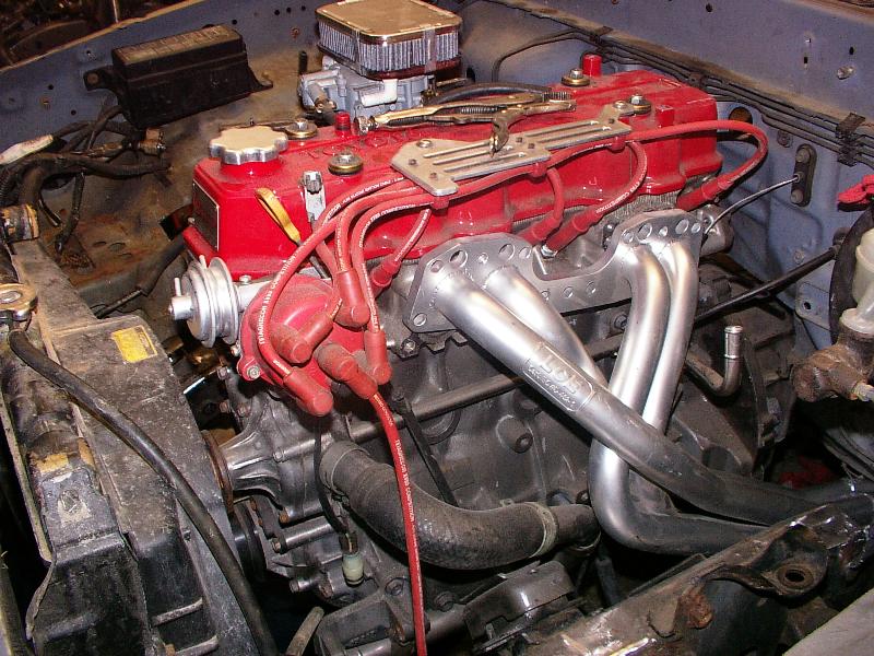 22re converted to carb with a weber, lc eng headers, lc engineering fan painted red to match truck, lc engineering polished water pump pulley, lc engineering billet underdrive pully, lc engineering red powdercoated valve cover, 200 amp gm alternator powdercoated back with chrome pulley and chrome fan, lc engineering polished distributor without vacume advance, billet spark plug wire holder, lc red spark plug wires and cap, msd universal coil, and some chrome and paint in the near future.
