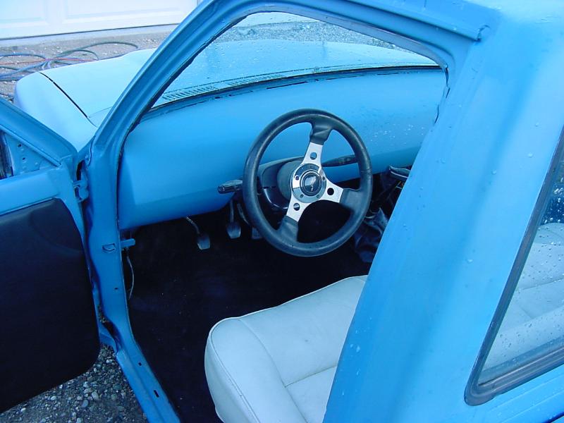 cream color custom bench chopped off the headrests, and added some padding. Custom sheetmetal dash with capped ends and capped column. raised up tranny hump.
