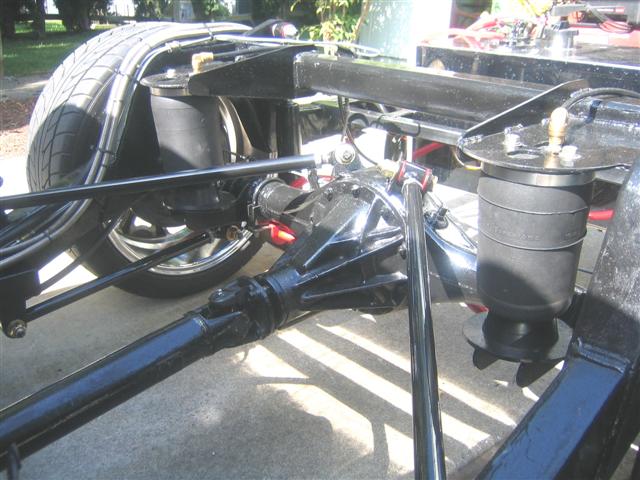 Belltech spindles,Gravity-Werx tri 4-link forward mounted,Firestone 9000 sleeve bags slightly forward of the axle,Energy suspension bushings,Doetsch shocks, & Quickior sway bars,CanDo c-notch,fender tubs front & rear, & a custom center cover,CanDo custom arms,Slam RE6 bags,& relocated shocks.