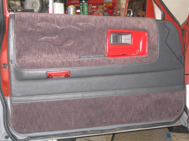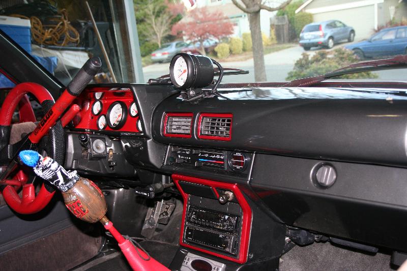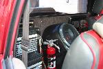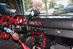 smoothed dash w/ custom gauge insert w/ AutoMeter Phantom gauges, Grant wheel, seat covers, & painted red trim, Odyssey battery relocated to interior, custom console & custom amp & electric panels,custom headliner w/flames laid in