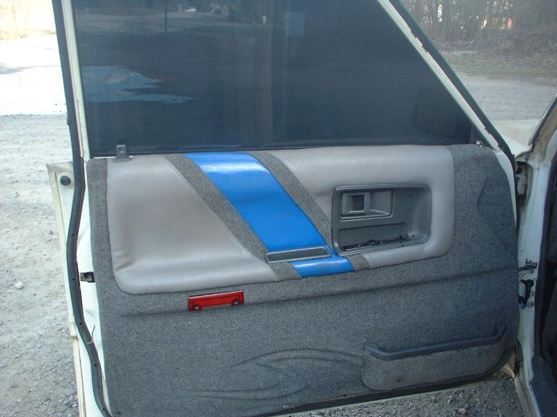 fully custom interior, w/ tribal disigns in the doors and dash. momo steering wheel. blue dash molding. dvd screen. playstation2. all blue neons. remote door popper kit. power windows.