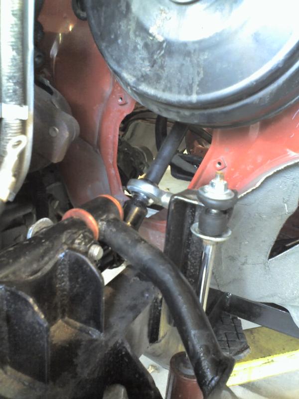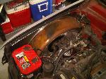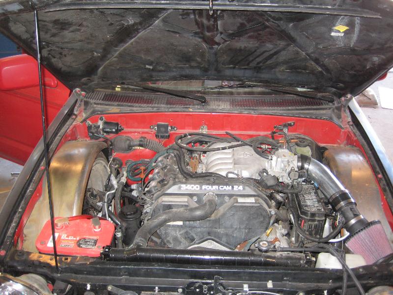 stock V-6 with an intake adaptor to reverse the plenum for clearence to keep stock hood . installed a custom fuel cell with stock sump, and new exhaust with magnaflow cat and cherry bomb muffler.
