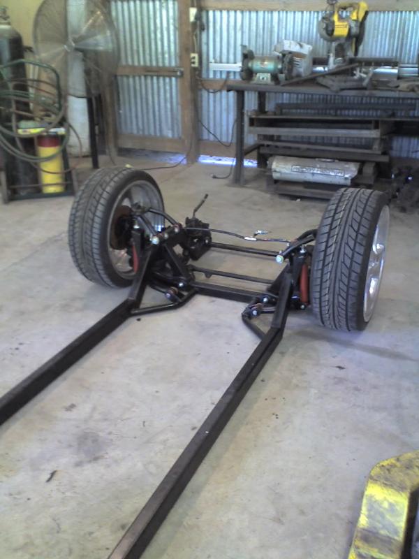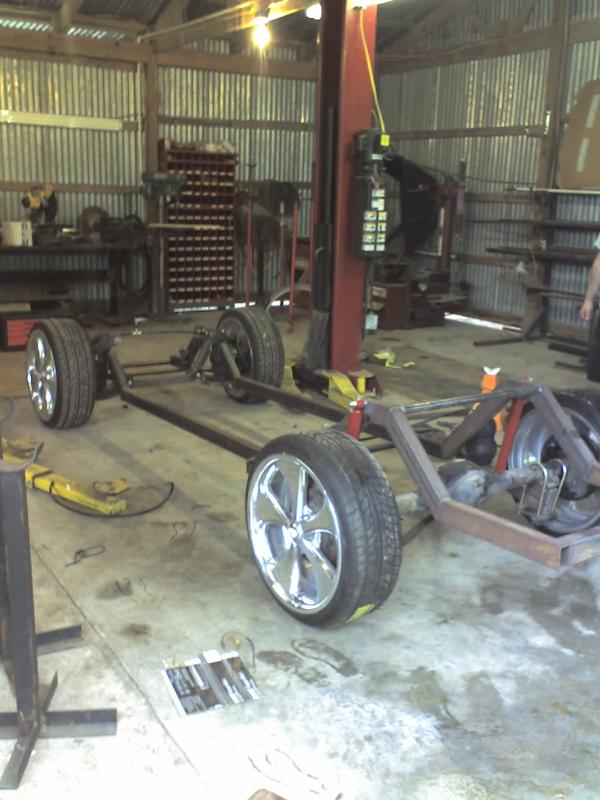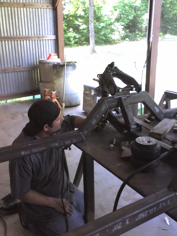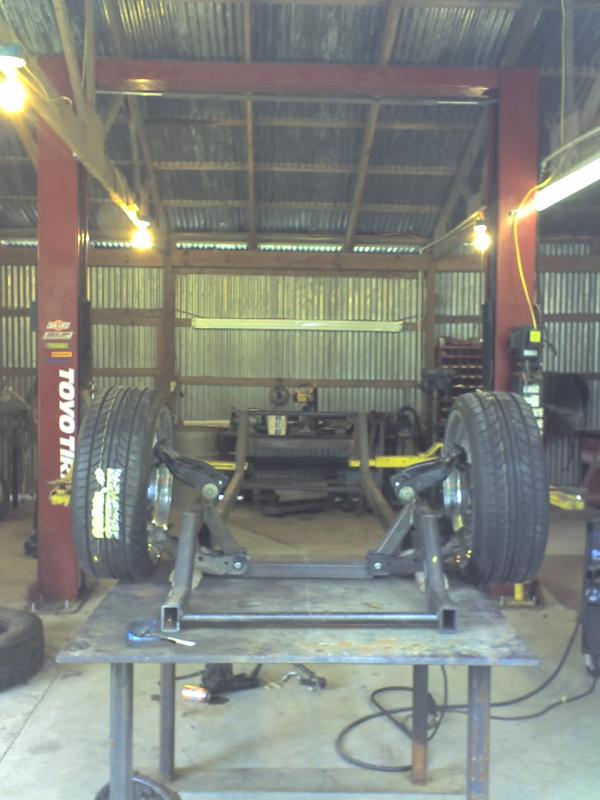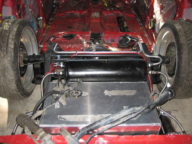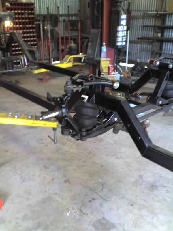 full frame 2x3 box tube,front-tubuler upper control arms, a'd the lower stock arms, belltech spindles and slam bags. rear-93 axle with a 2-link on slams and a custom two piece drive shaft for clearence issues. two viair 480c's with gc valves 5 gallon tank, and aluminum air line.