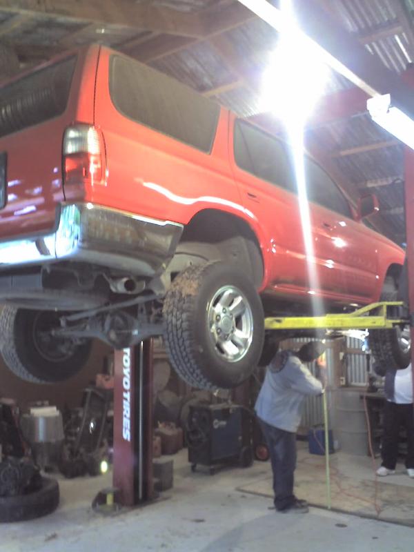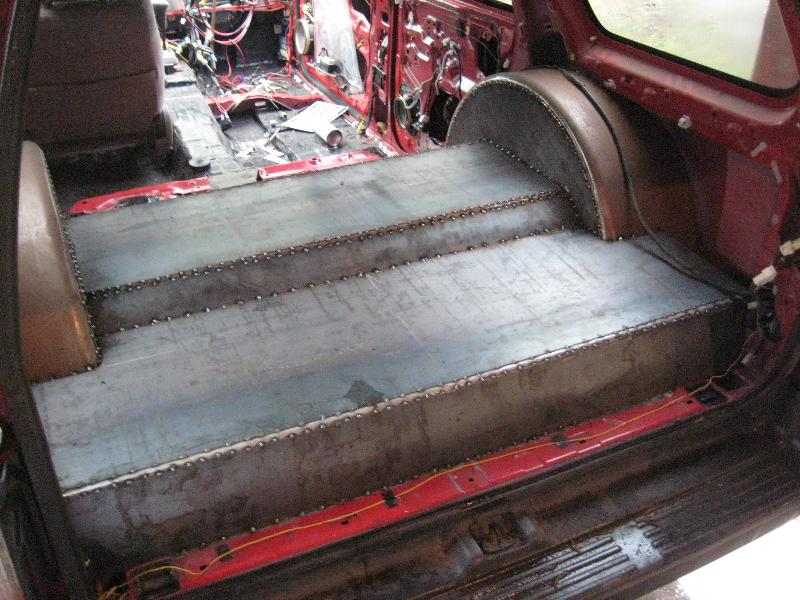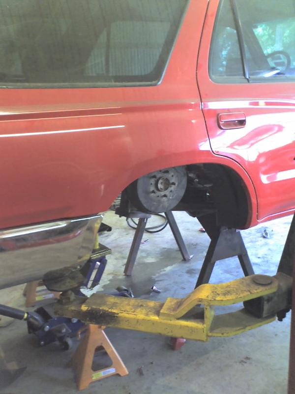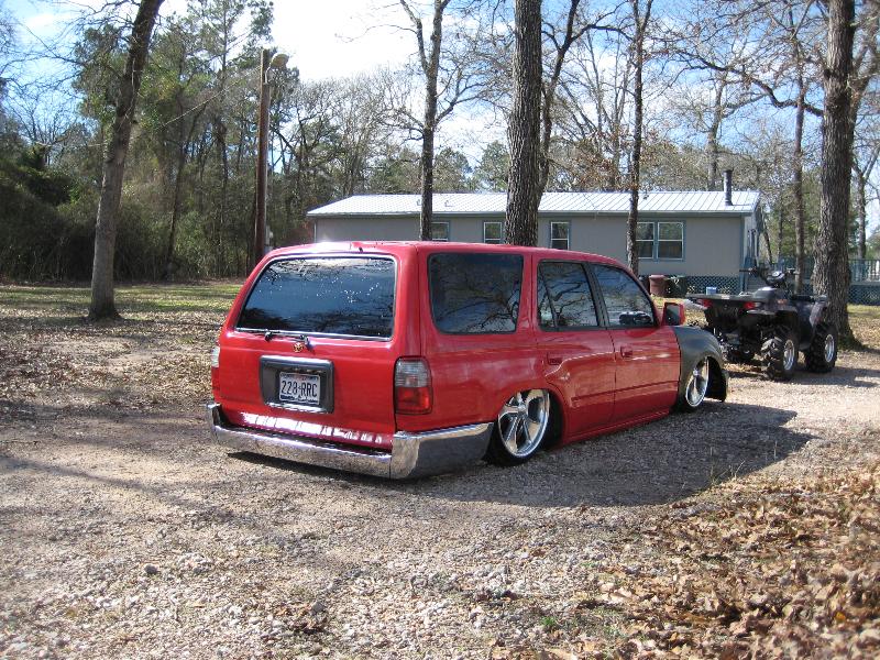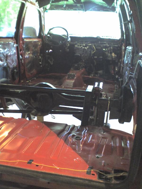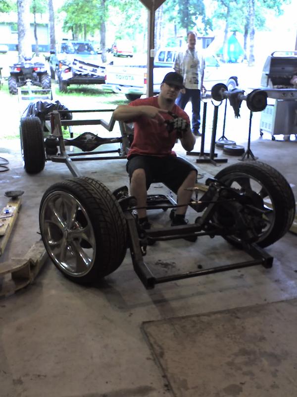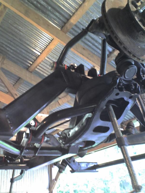 full frame 2x3 box tube,front-tubuler upper control arms, a'd the lower stock arms, belltech spindles and slam bags. rear-93 axle with a 2-link on slams and a custom two piece drive shaft for clearence issues. two viair 480c's with gc valves 5 gallon tank, and aluminum air line.