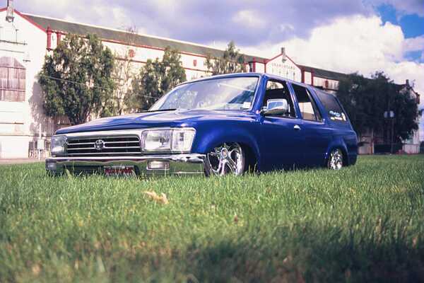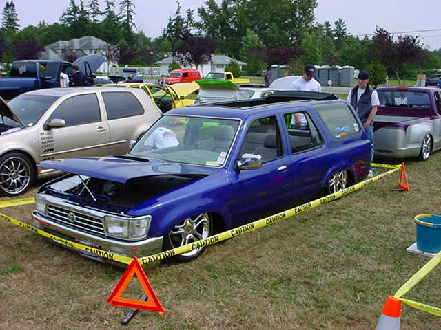 The body work of my IVRunner was all done in my garage, not a shop, so the first order of business was to raise the cab floor a total of three inches to allow IV the marriage of the rocker panels to the ground. To allow clearence IV the motor and to retain a factory appearing hood a Subaru hood scoop was grafted in place. The stock 2WD front fenders were then exchanged IV IVWD units IV better tire clearence. Papa Harry, who helped me with the body work and paint, then completely shaved and reworked the body with a few subtle yet custom touches here and there. The factory front door handles were removed and replaced with a set of Nissan Altima door handles while the rear doors have been void of any such handles. The typical IVRunner rear bumper and rear quarter panels just below the belt line were cut off and replaced with IVWD bed sides and a custom made roll pan. IV a cleaner appearence in the rear the tailgate was shaved and a slanted license plate box with personalized plate (POUNDED) was welded in. The rear tail lights were then shaved and a set of Hi-Tech 6 inch LEDs were installed on the inside of the power tailgate window. Other items that were shaved off the cab include all the emblems, antenna and the fuel door while a huge hole was cut into the roof to allow IV a Street Beat slider to be installed. Once all the body work was done to satisfaction Papa Harry then applied a basecoat of 98 Accura Integra Super Sonic Blue Pearl. To obtain the right depth, he applied several coats of clear and massaged it to a show room shine. Once all the paint work had been completed a chrome IVWD front grill, side marker lights, bumper and lower valance with Billet insert was added to the front. The stock lenses were also replaced with clear units IV an up to date look. I would like to extend thanks to Saturday Joey, Papa Harry and all the Members of the IV EVER LOW Chapter in Idaho ,IV giving their hand in helping me to complete my IVRunner.