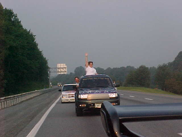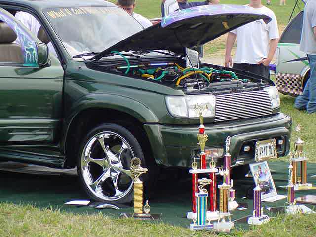emerald green w/ small gold flakes, matrix mural on hood, airbrushed lightning on visors,neons,strobe lights and tons more!