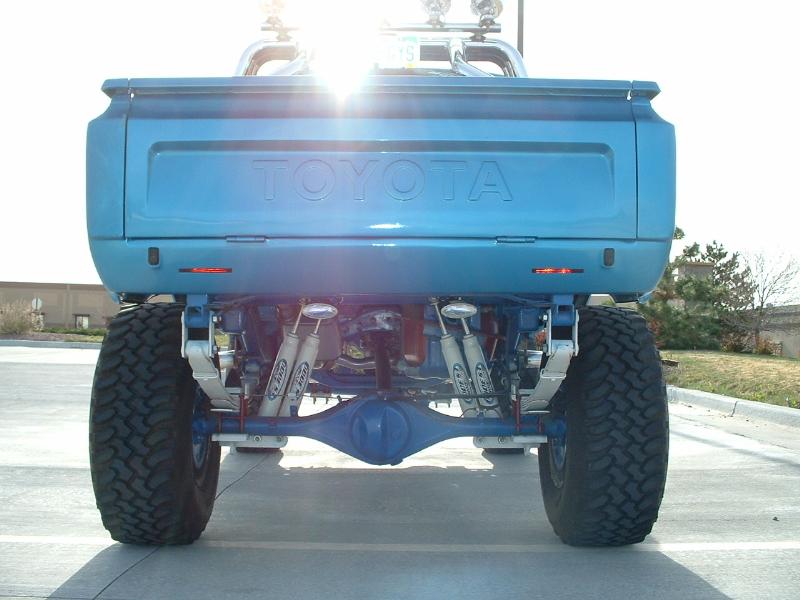 Front: 2 1/2" springs, 2 1/2" shackles,custom spring hangers with a 1" added for the weight of the V8 motor,moved the crossmember back 10" for the 5-speed tranny,moved the brackets to the inside of the frame,double shocked the rear,shaved & boxed the rear frame at the end of the shackles.