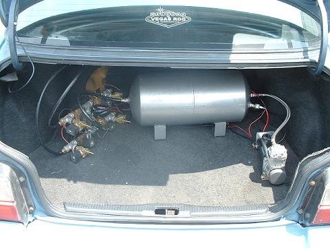 DRAGGIN SO HARD with 4 MAC AIR cylinders with 4 KMC 1/2 inch values (up) and 4 KMC 1/4 inch values (down)with 6 gal air tank and a 450 viair compressor