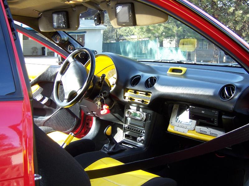 CUSTOM YELLOW ON BLACK SEATS FULL RACTIVE TRIM WITH PEDALS GEAR SHIFT BOOT AND SHIFTER AND SEAT BELT PADS. CUSTOM GAUGE CLUSTER ON A PILLAR. CUSTOM MOUNT RADAR DETECTOR AND GPS