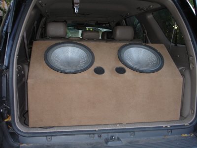 stock with 2 pioneer 15's, 400 watt pti, 6 dusc changer, dvd player, headrest tv
