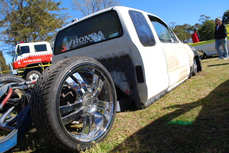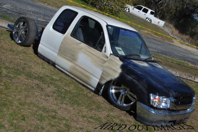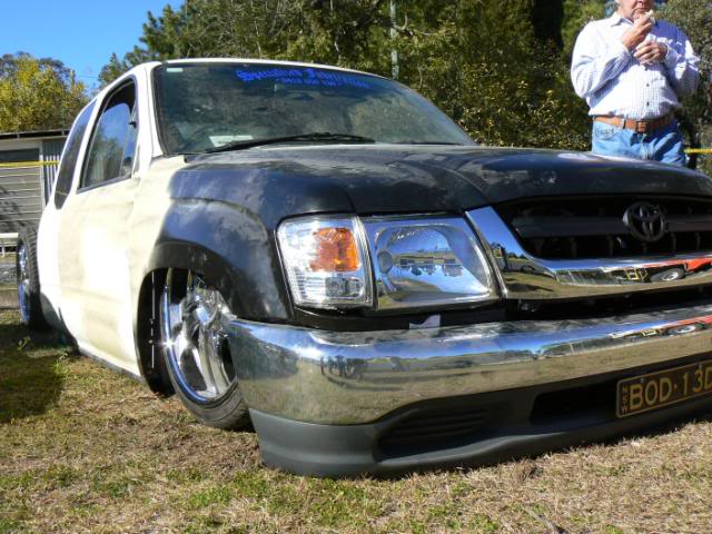 3 ¼ " traditional body drop. Suicide doors. Shaved doors, guards, roof lines, bonnet, tail lights, tailgate, etc. 2003 SR5 Hilux front end conversion. Round LED tail lights in rollpan. False floored tub with hatch.