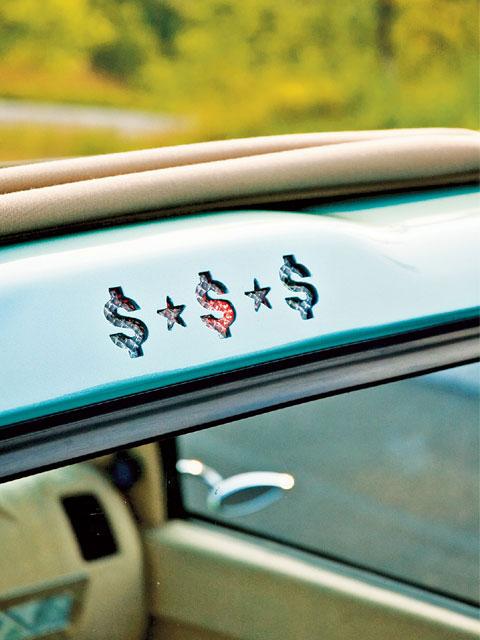 Malibu sand tweed, tons of billet and chrome, one off air gauge mount, embroidered seat, 100 dollar bills and skulls. Fully carpeted with bisquik carpet. Custom fiberglass center console. Hand made door panels that house two sets of audiobahn 6.5 inch 2 way speakers. custom kick panels with 5 and a quarter audiobahn 2 way high's, flamed billet door handles. Raised flames on dash, A-pillers, and door panels. Billet gauge cluster surround, Flamed gauge overlay and all plastic painted to match. Colorado customs billet flamed steering wheel with one off engraved horn button. Custom shortened and bent shifter with hand made skull shift knob.