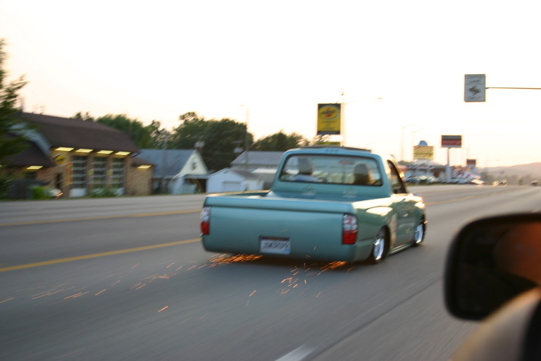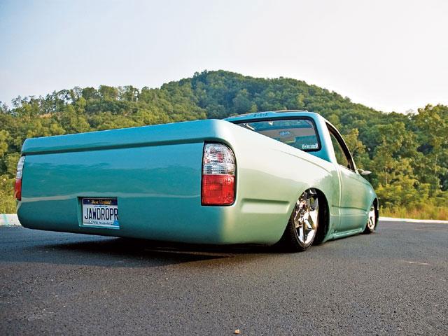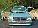 Just repainted AUG 07 custom mix PPG money green. Shaved: handles, gas door, rear cab lines, mirrors, antenna, wiper squirters. Billet mirrors. Molded headlight filler panels to fenders. Molded fenders, Full skin combo. Tan rag top, billet grill, 4 wheel drive chrome bumper, 2 wheel drive valance and billet insert, half cab cut out for stereo, custom one off third brake light, flared bed sides, turn signals moved to side markers, suicide doors with filler panels welded to cab between fender and cab. Full sheet metal bed with radiused rear bed corners and half round metal speaker enclosure.