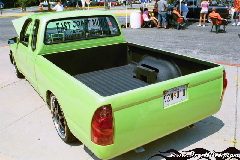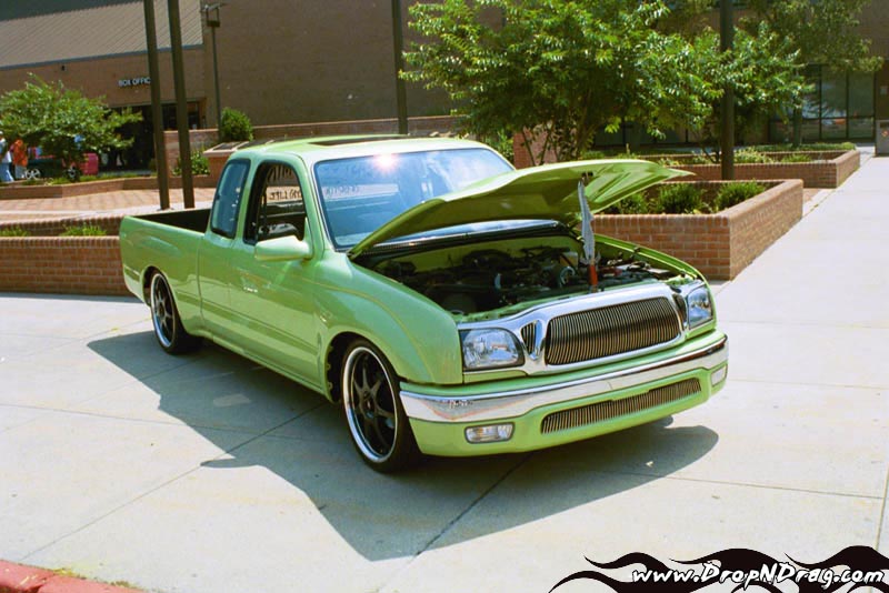 Fully shaved (door handles, corner lights, antenna, third brake light w/ hump, gas door, taillights) CanDo Specialties tailgate/rollpan combo skin w/ frenched license plate box, skinned inside of tailgate and inside the front of the bed, re-located lower body line on the bottom-rear of both sides of the truck, 2005 Tacoma taillight conversion, Church-Steeples.com Cowl Induction Hood, JBM Vertical Billet Grille and Bumper inserts, converted to all clear glass, of course removed all emblems