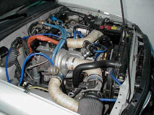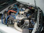 2.4L auto, EL Prototypes turbokit (T3/T4 turbo - 15psi),Spearco intercooler, 440cc Supra injectors, HKS muffler w/2.5in custom piping, single high flow cat. Hayden tranny cooler, built auto tranny w/custom torque converter & valve body