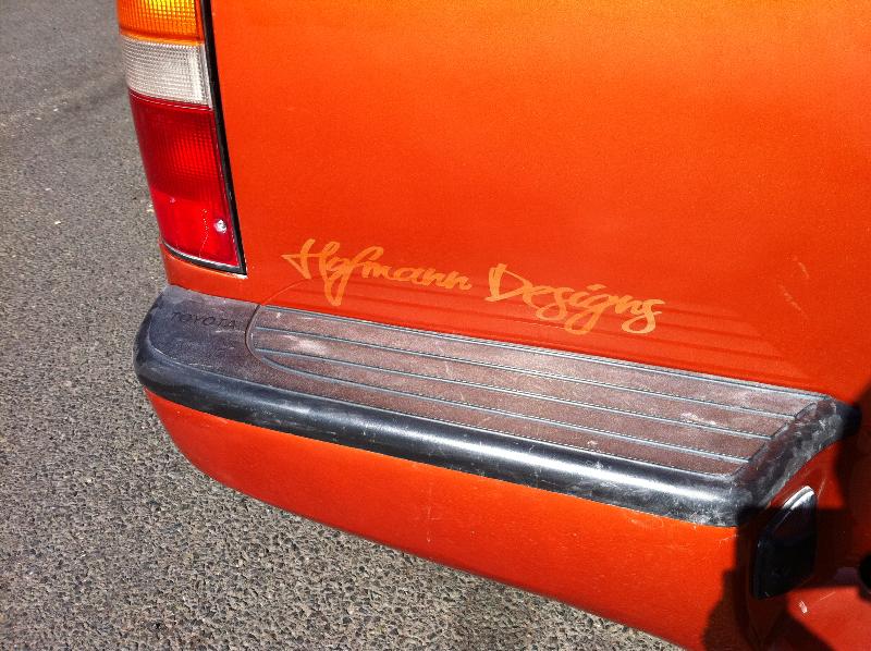 shaved squirters, antenna, gas door, tailgate handle with tailgated molded shut and molded in sectioned rear bumper. stock bed floor with sheetmetal sides, linex'd. Painted GM Atomic Metallic Orange.