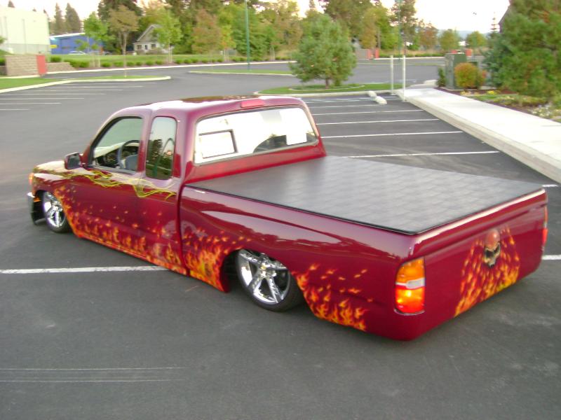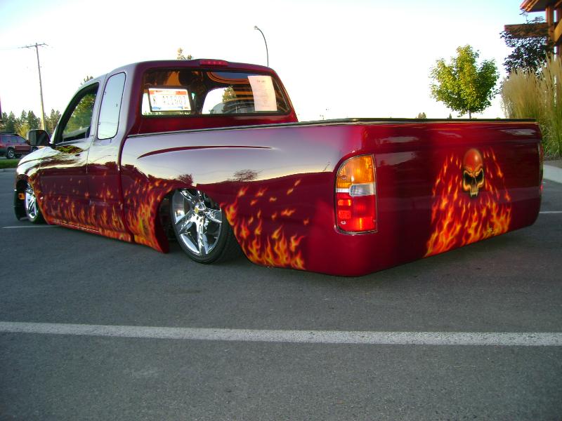 hell raising, 01 4runner frontend, full sheetmetal bed, custom made rollpan, tailgate trimed 2 inches to weld together and make body line under taillights never seen before guarenteed everything shaved, custom teardrop supports inside the bed wells. lots of airbrushing and pinstriping
