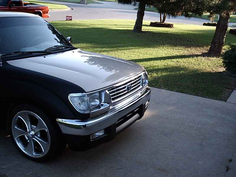 4x4 Front clip all factory toyota parts, Flared bedsides 2 inches on either side, Tonneau cover painted to match, Clear corner markers, turn signals and diamond headlight conversion.