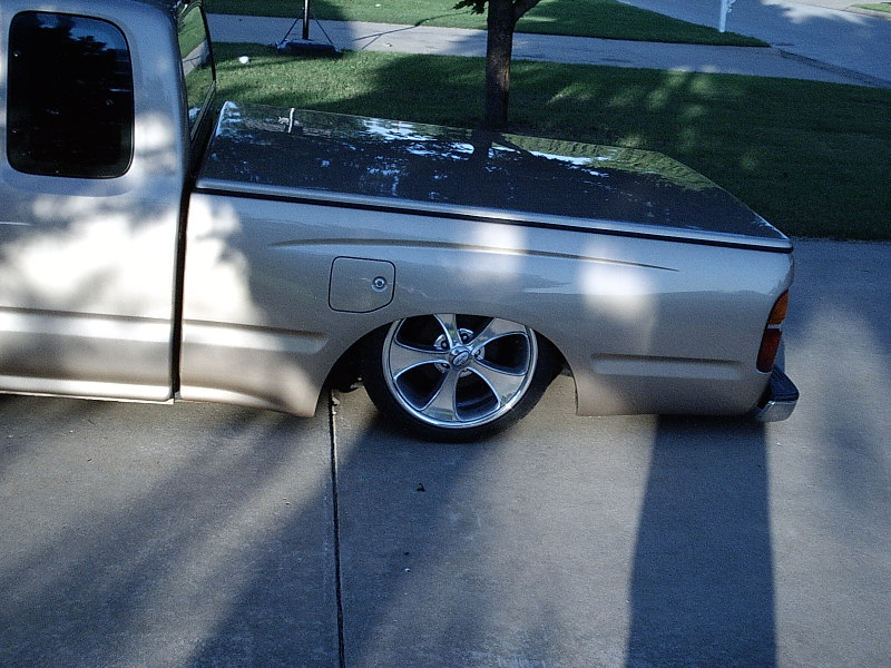 18x8-1/2 Boyd Coddington Magneto wheels on all four corners with nitto 555 18/40/225 meat. Powerslot slotted front rotors and TRD brake pads.